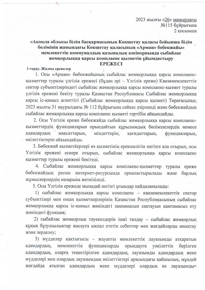 АҚМОЛА ОБЛЫСЫ БІЛІМ БАСҚАРМАСЫНЫҢ КӨКШЕТАУ ҚАЛАСЫ БОЙЫНША БІЛІМ БӨЛІМІНІҢ ЖАНЫНДАҒЫ КӨКШЕТАУ ҚАЛАСЫНЫҢ "АРМАН" БӨБЕКЖАЙЫ" МЕМЛЕКЕТТІК КОММУНАЛДЫҚ ҚАЗЫНАЛЫҚ КӘСІПОРНЫ