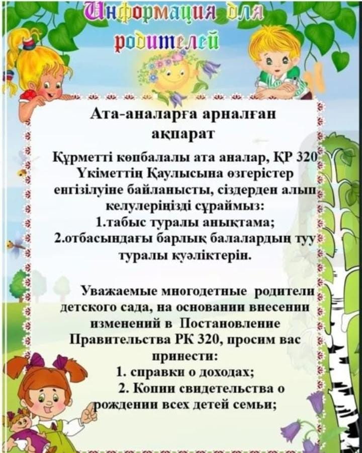 Құрметті көпбалалы ата-аналар, ҚР 320 Үкіметтің Қаулысына өзгерістер еңгізілуіне байланысты, Сіздерден келесі құжаттарды алып келулеріңізді сұраймыз: