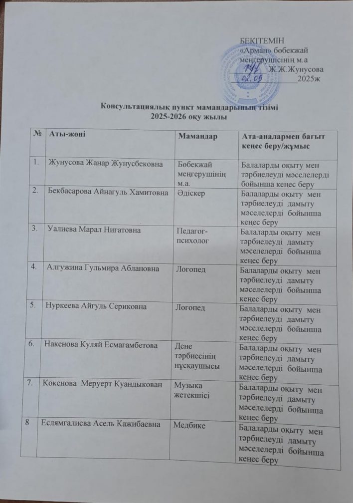 Консультациялық пункт мамандарының тізімі 2025-2026 оқу жылы